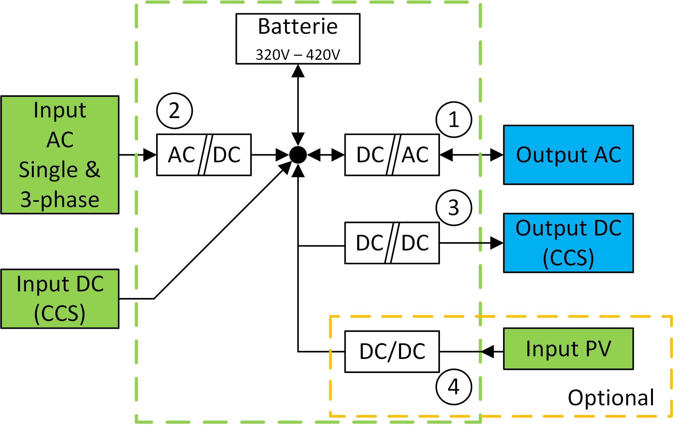 Um den unterschiedlichen Anforderungen gerecht zu werden, wurden verschiedene Konzepte entwickelt und auf die Machbarkeit geprüft. Die Systemkonzepte sind flexibel, einfach sowie für grössere Leistungen und Batteriekapazitäten skalierbar. Abhängig von benötigen Funktionen und der vorgegebenen Spezifikationen der Batteriespannung eigenen sich einige Konzepte besser als andere. Sie alle bieten die Möglichkeit, die Batterie vom Netz als auch über eine CCS-Ladestation laden zu können. Ebenfalls unterstützen die Konzepte die Möglichkeit, E-Fahrzeug über die verbaute CCS-Schnittstelle zu laden. Mit der Option einer PV-Anbindung kann der Speicher noch ökologischer betreiben werden.