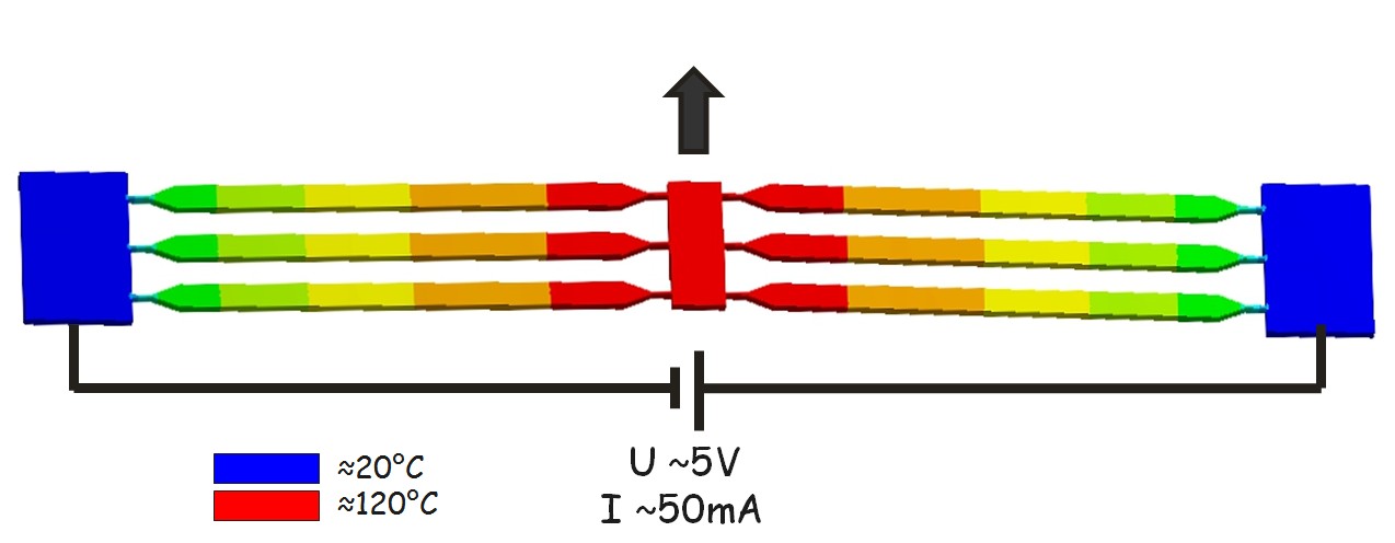 Das Prinzip basiert auf zweiseitig eingespannten schenkelartigen Strukturen durch welche ein Heizstrom fliesst. Die Schenkel wirken dabei als Widerstandsheizer. Die Erwärmung der Schenkel führt zu einer thermischen Ausdehnung der Schenkel und diese wird durch eine geeignete Schenkelanordnung in eine lineare Bewegung übersetzt.