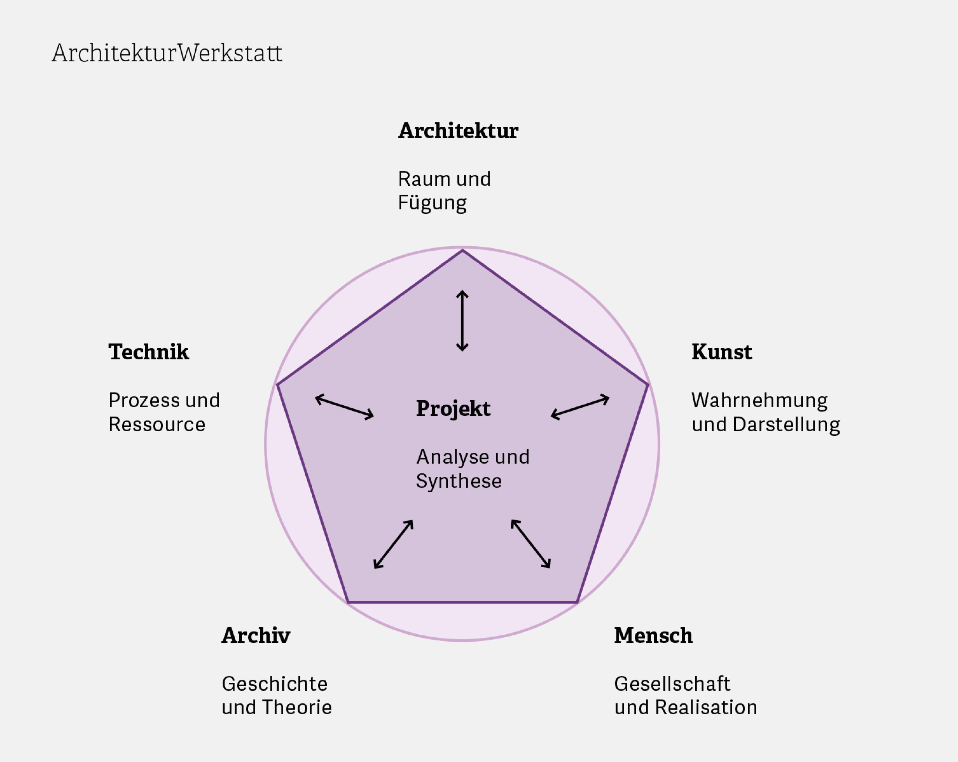 Die Wissensvermittlung an der ArchitekturWerkstatt findet projektgebunden statt. Der Entwurf steht im Zentrum des Unterrichts. Die unten vorgestellten Lernbereiche decken einerseits die klassischen Kerndisziplinen der Architektur ab und vermitteln anderseits Fachwissen, das befähigt, die in der Architektur mitwirkenden Disziplinen zu verstehen und dieses Wissen für den Entwurf anzuwenden.