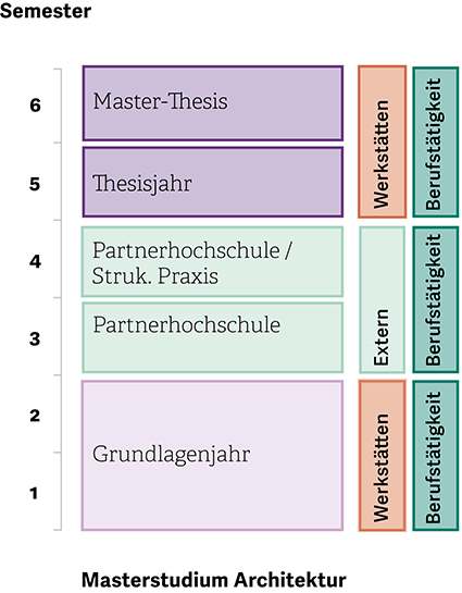 Das Curriculum des Masterstudiengangs sieht nach dem Mastergrundlagenjahr ein Auslandsjahr von zwei Semestern vor. Sie absolvieren entweder beide Semester an einer Partnerhochschule im Ausland, oder ein Semester an einer Partnerhochschule und ergänzen das Auslandssemester durch ein strukturiertes Praxissemester in einem in- oder ausländischen Partnerbüro, so dass das duale System auch im Austauschjahr weitergeführt wird.