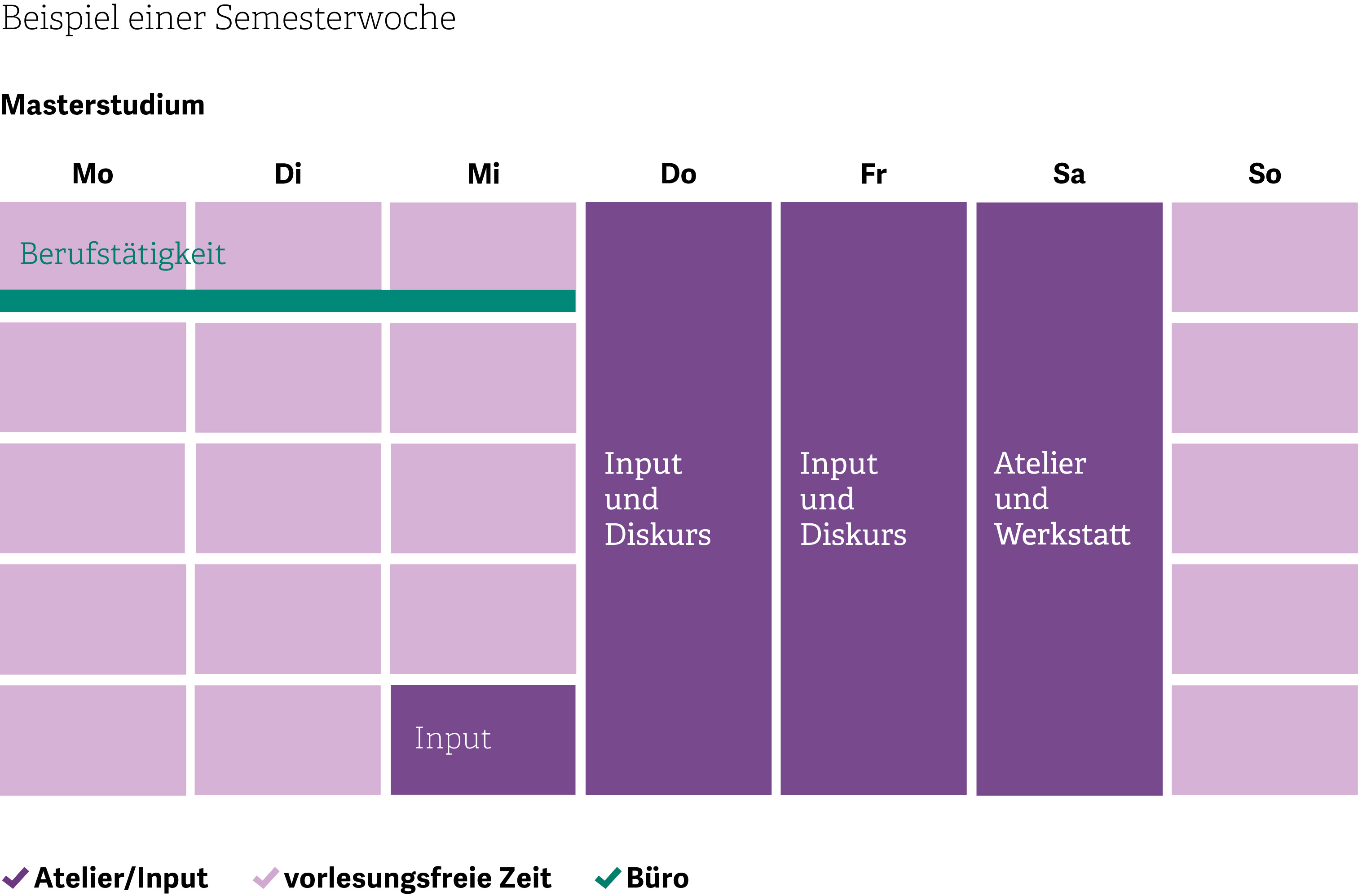 Gemeinsame Arbeitsplätze der Studierenden aller Jahrgänge unterstützen die Vermittlung von Inhalten und fördern den unmittelbaren Austausch zwischen Studierenden, Dozierenden und den in die Ausbildung eingebundenen Disziplinen. Das gemeinsame Arbeiten stärkt das Verständnis für spezifische Fragestellungen und Themen ebenso, wie die Entwicklung von persönlichen Kompetenzen und einer gemeinsamen Berufsidentität.