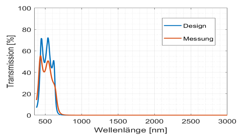 Mit den Erkenntnissen aus den Prozessentwicklungen konnte ein Filterstapel mit 15 Schichten aus den Materialien SiO2 und Ag abgeschieden werden. Die Qualifizierung des IR-Sperrfilters erfolgte über den wellenlängenabhängigen Transmissionsgrad. Die Transmissionsmessung des Filterstapels wurde mit dem Design verglichen. Das Design zeigt im sichtbaren Spektralbereich eine mittlere Transmission von 31.9%, während der beschichtete Filter eine mittlere Transmission von 27.6% aufweist.