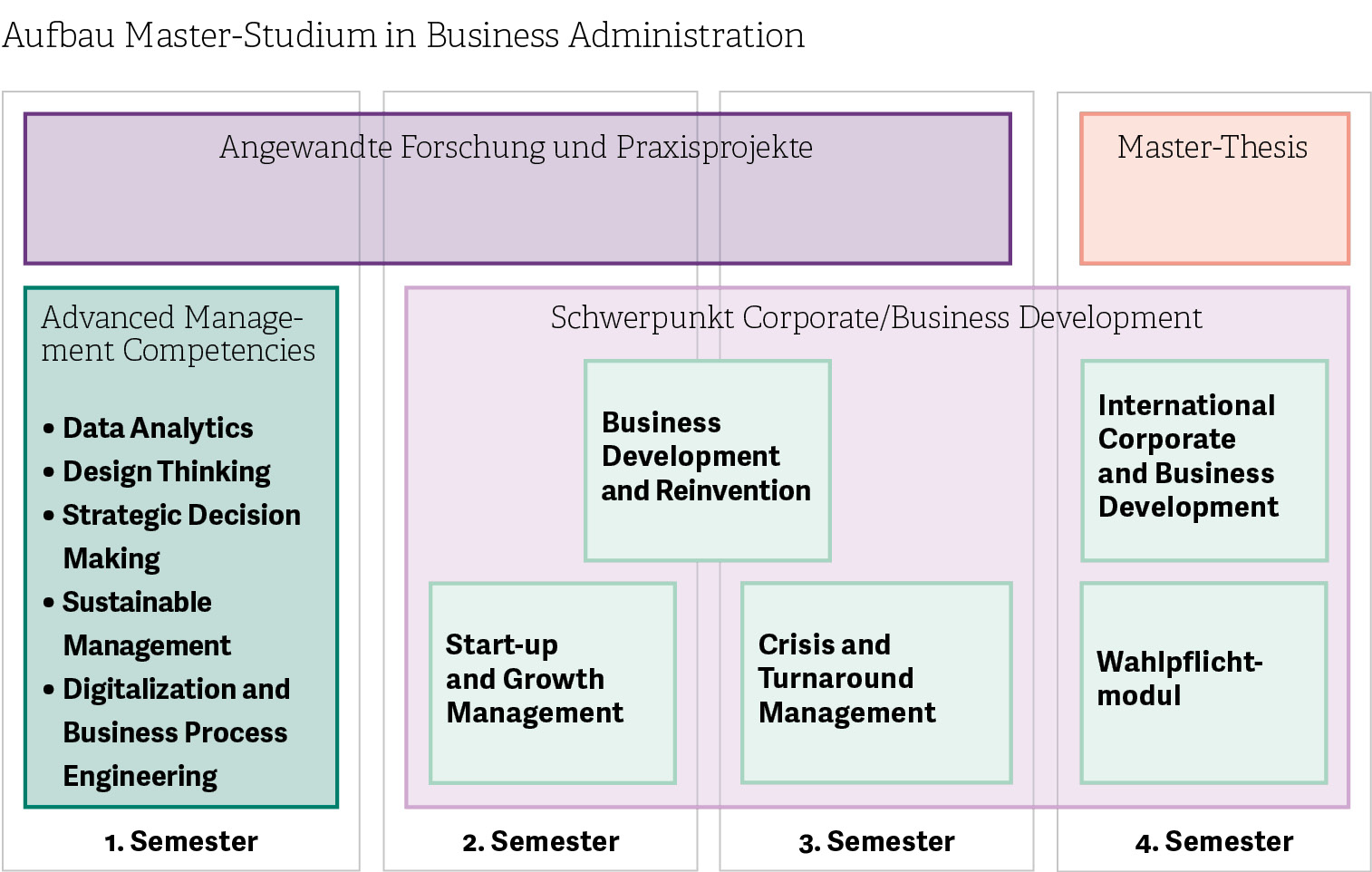Die Modulgruppe «Advanced Management Competencies» fokussiert auf die Vermittlung von grundlegenden Fertigkeiten für eine erfolgreiche Aufgabenerfüllung im Management. Darauf aufbauend umfasst der Major «Corporate/Business Development» die Module der Vertiefungsrichtung des Studiengangs. Die Modulgruppe «Angewandte Forschung und Praxisprojekte» beinhaltet die Vermittlung von anwendungsnaher Forschungskompetenz und deren Umsetzung in konkreten wissenschaftlichen Praxisprojekten. In der Master-Thesis wird eine selbst gewählte, anwendungsnahe Forschungsfrage von den Studierenden fundiert aufgearbeitet.