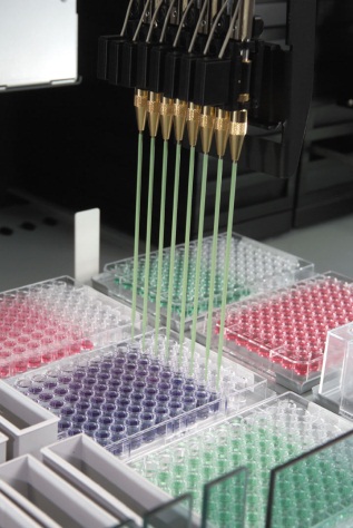 The pipetting robots are equipped with modern sensors that detect when a pipette touches the underlying liquid.