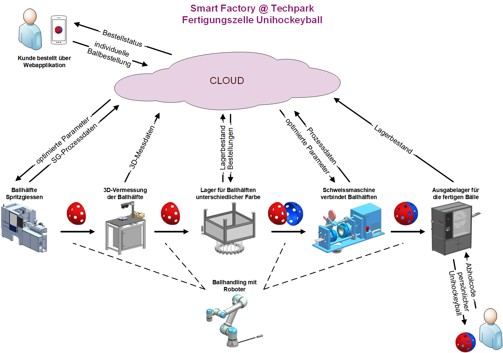 The ILT and other institutes of the OST are currently working on the construction of a Smart Factory in the new Techpark. One highlight will be the fully automated production cell for customised floorballs.